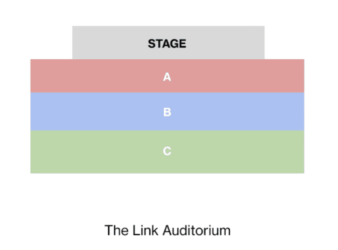 The Link Auditorium boasts incredible acoustics in St. Louis, second only to the Fox Theatre. Our venue offers unobstructed views of the stage from any of the sections listed in the seating diagram below.