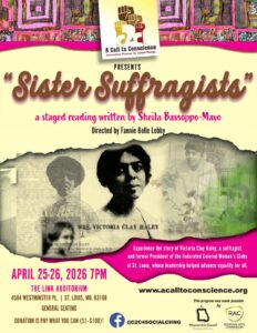 SISTER SUFFRAGISTS April 25-26, 2026 | 7 PM A staged reading written by Sheila Bassoppo-Mayo Presented by A Call to Consience: Interactive Theater for Social Change Experience the story of Victoria Clay Haley, a suffragist and former President of the Federated Colored Women’s Clubs of St. Louis, whose leadership helped advance equality for all. The …